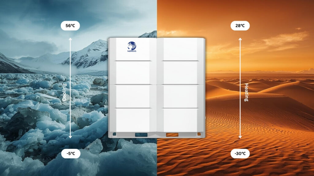 Pateicoties plašajam darbības temperatūras diapazonam (–30 °C līdz +56 °C), NØRDIS VRF sistēmas darbojas efektīvi pat ekstremālos klimatiskajos apstākļos, nodrošinot uzticamu dzesēšanu un apkuri visa gada garumā un ilgtspējīgus komforta risinājumus mūsdienīgām ēkām.
