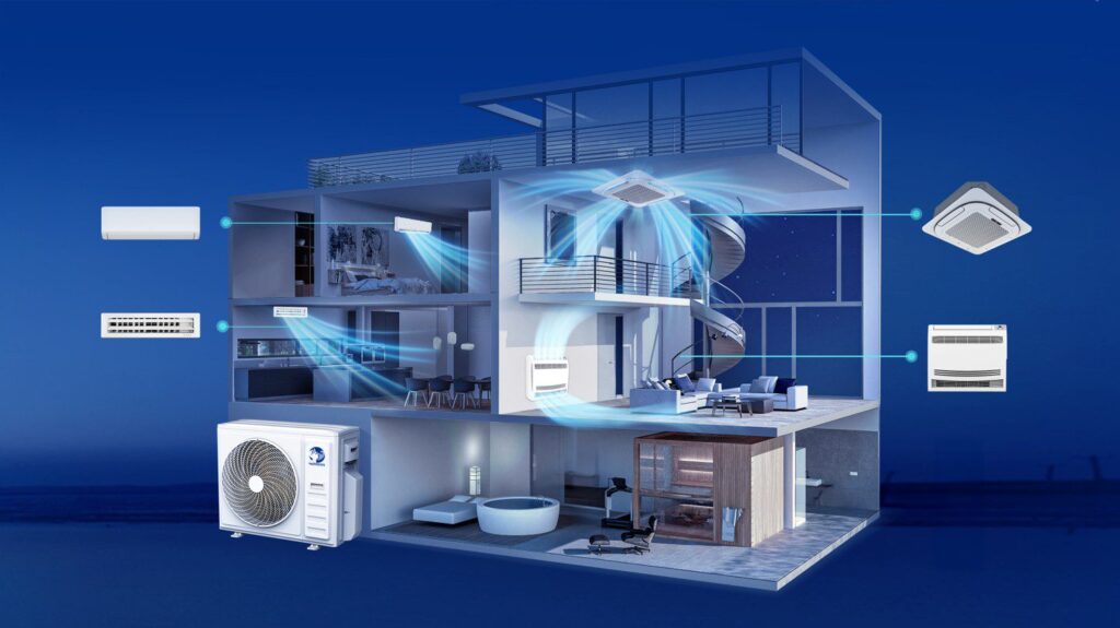Sistēma ļauj pieslēgt līdz pieciem iekštelpu blokiem vienai āra iekārtai, nodrošinot komfortablu mikroklimatu vairākās telpās vienlaikus. Šis risinājums ir īpaši piemērots dzīvokļiem, birojiem un viesnīcām, kur svarīga ir telpas efektīva izmantošana un estētiski tīrs ēkas ārējais izskats. Centralizētā darbība nodrošina efektīvāku apkures un dzesēšanas enerģijas sadali starp telpām, samazina elektroenerģijas patēriņu un uztur vienmērīgu temperatūras līdzsvaru visā ēkā.