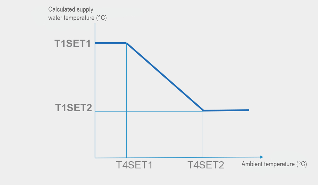 Izmantojot laikapstākļu temperatūras līknes funkciju, ūdens temperatūra automātiski mainās atkarībā no āra gaisa temperatūras. Paaugstinoties vai pazeminoties āra gaisa temperatūrai, apkures slodze attiecīgi samazinās vai palielinās, un ūdens temperatūra automātiski pielāgojas. Tāpat, mainoties āra gaisa temperatūrai, automātiski mainās arī dzesēšanas slodze un ūdens temperatūra. Pieejamas kopumā 32 fiksētas laikapstākļu temperatūras līknes un viena pielāgojama līkne, kas nodrošina elastīgu temperatūras regulēšanu dažādām vajadzībām.