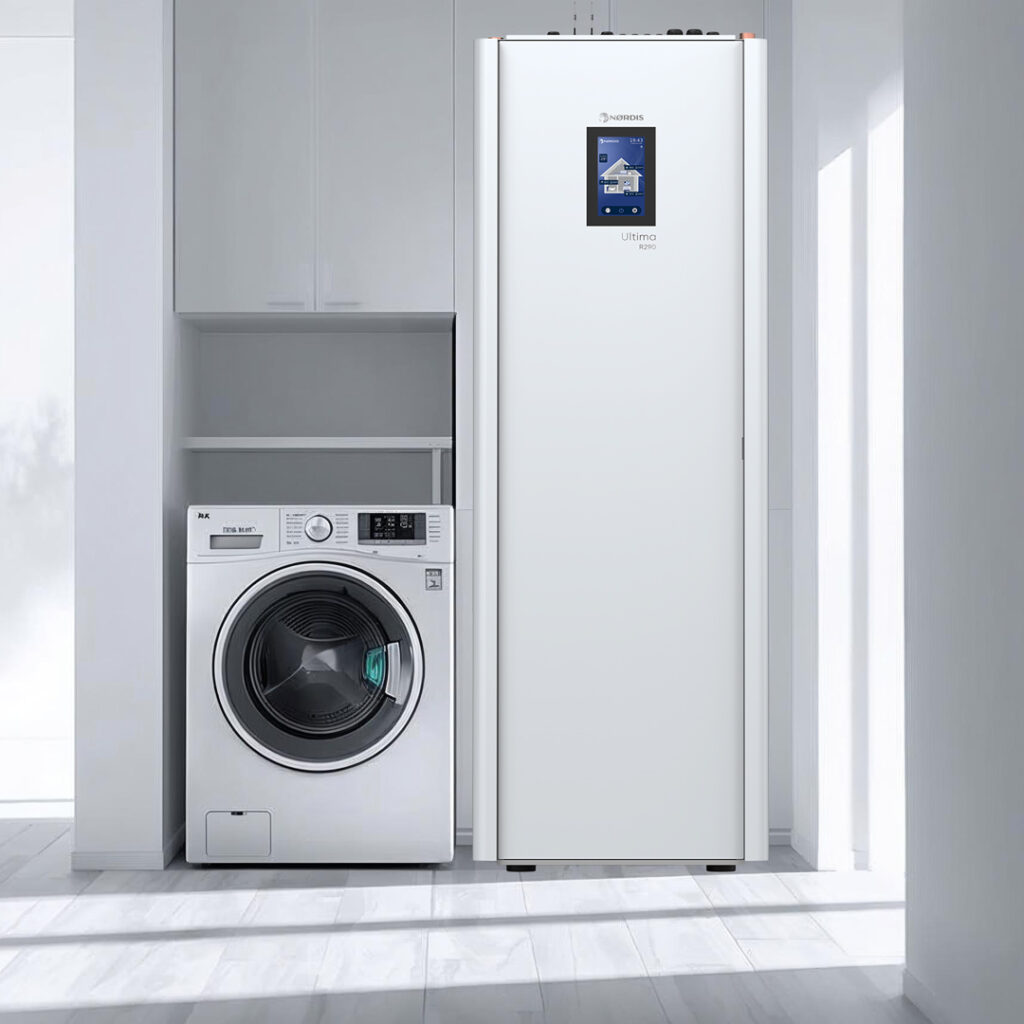 NØRDIS Ultima Mono iekštelpu iekārta ar integrētu karstā ūdens tvertni ir daudzfunkcionāls risinājums, kas vienā kompaktā iekārtā apvieno apkures, dzesēšanas un sadzīves karstā ūdens nodrošināšanas funkcijas.